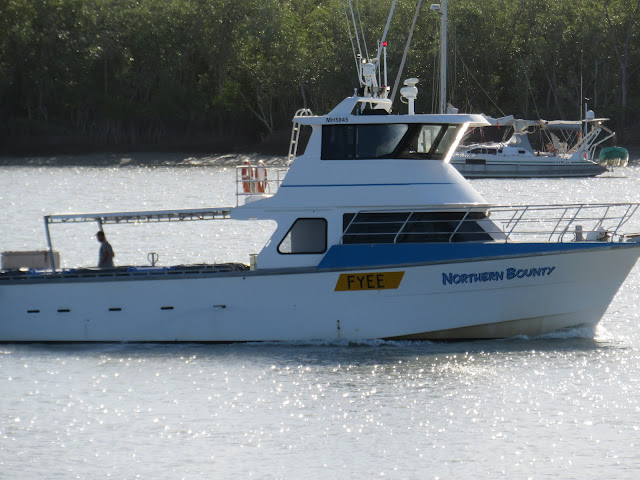 We had Barra there for lunch (of course), then the men went back. Dell & I spent more time looking before walking back via the butcher, shop and a gift store. Had happy hour by the water (and saw the croc out on the mud spit until a passing boat spooked him).