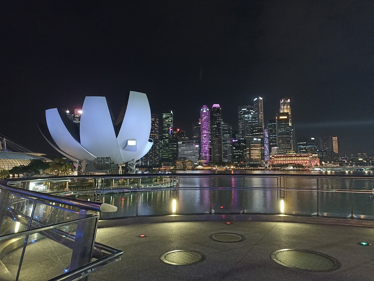 ArtScience Museum and city towerblocks, and sports stadium seating on the right